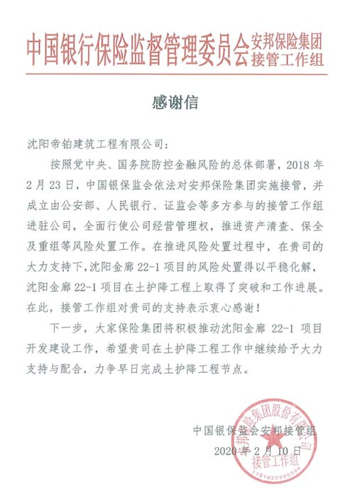 復工的同時,我們還收到了中國銀保監會安邦接管組的感謝信,中國銀保監會安邦接管組對我司的各項工作表示了高度的肯定,認真的工作態度,有序的工作方式,造就了屹立不倒的帝鉑鐵軍!